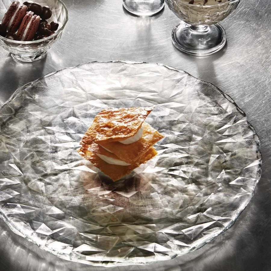 Het Bormioli Onderbord zorgt door zijn gebroken patroon voor een stijlvolle dinertafel. Het bord is uitermate geschikt voor zowel voorgerechten als nagerechten. Het transparante bord heeft een diameter van 33 cm en kan na gebruik gereinigd worden in de vaatwasmachine. Het servies van de Bormioli Diamond collectie is gemaakt van dun glas.