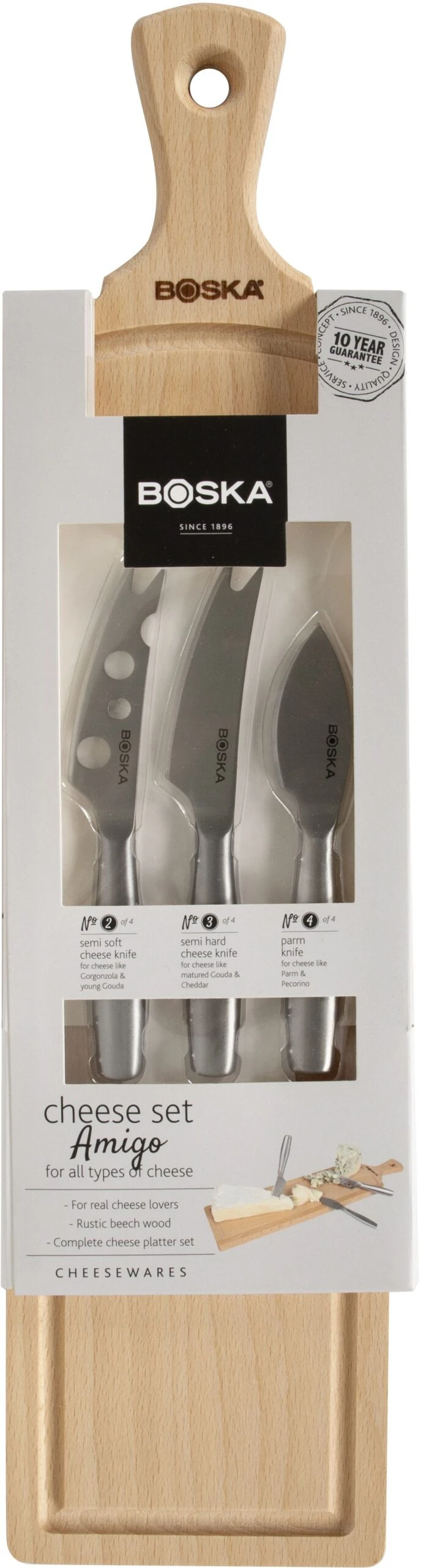 Met de Boska Kaasset Amigo serveer je het perfecte kaasplankje. Met de 3 verschillende kaasmessen en een mooie rustieke kaasplank kom je niks te kort om vrienden of familie te verrassen met de heerlijkste soorten kaas. De inbegrepen mesjes van de Copenhagen collectie zijn van hoge kwaliteit en je kan er alle soorten kaas mee snijden. De plank heeft overigens een mooi handvat waardoor je hem makkelijk serveert.