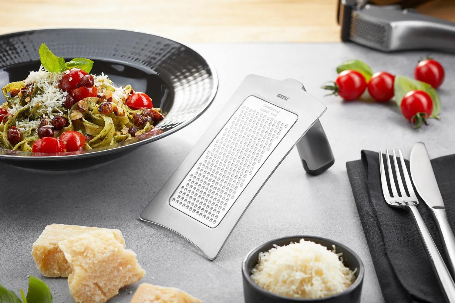 Met de Gefu Gourmet Rasp kun je gemakkelijk en snel je gerechten raspen. De Gourmet rasp heeft een ergonomisch handvat, waardoor je hem gemakkelijk vast kunt houden. Daarnaast zit er genoeg afstand tussen de rasp en het handvat waardoor je je niet snel kan schaven aan de rasp. De Gourmet Rasp is gemaakt van RVS en na gebruik kan hij in de vaatwasser. Rasp snel en gemakkelijk je gerechten met de Gefu Gourmet Rasp Formaggio!