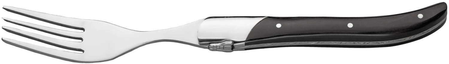 Deze stijlvolle steakmessen en steakvorken beschikken over een elegant zwart handvat gemaakt van ebbenhout. Het lemmet van het mes is 11.3 cm lang en 2.5 mm dik. Door het gladde snijvlak snij je eenvoudig door jouw perfect gegaarde vlees.