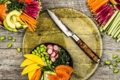 Keukenhakmes met een 15 cm lang lemmet van gehard Japans koolstofstaal. Ontworpen voor het snijden van groenten en vlees en het hakken van kruiden. Uitgerust met een comfortabel handvat van hard en duurzaam materiaal met drievoudige klinknagels. Het mes wordt geleverd met een lemmetbeschermhoes. Het is vaatwasmachinebestendig, maar handwassen wordt aanbevolen om de snijeigenschappen van het lemmet en de esthetiek van het mes zelf langer te behouden.