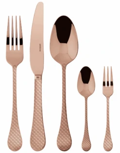 Klassiek, rustig en geïnspireerd door modetrends, dat is wat de Sambonet Taormina collectie is. Het bestek uit deze collectie wordt gekenmerkt door de print op de handvaten. Taormina is een verfijnd, modieus en tijdloos bestek wat prachtig staat op elke tafel. Verkrijgbaar in de bekende Sambonet kleuren en dankzij de PVD Coating is dit bestek extra stevig, kleurvast en 100% vaatwasserbestendig.Â
