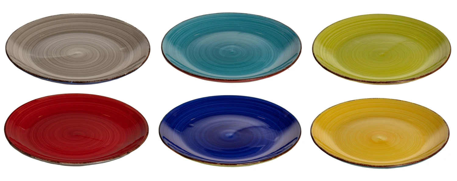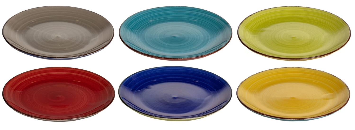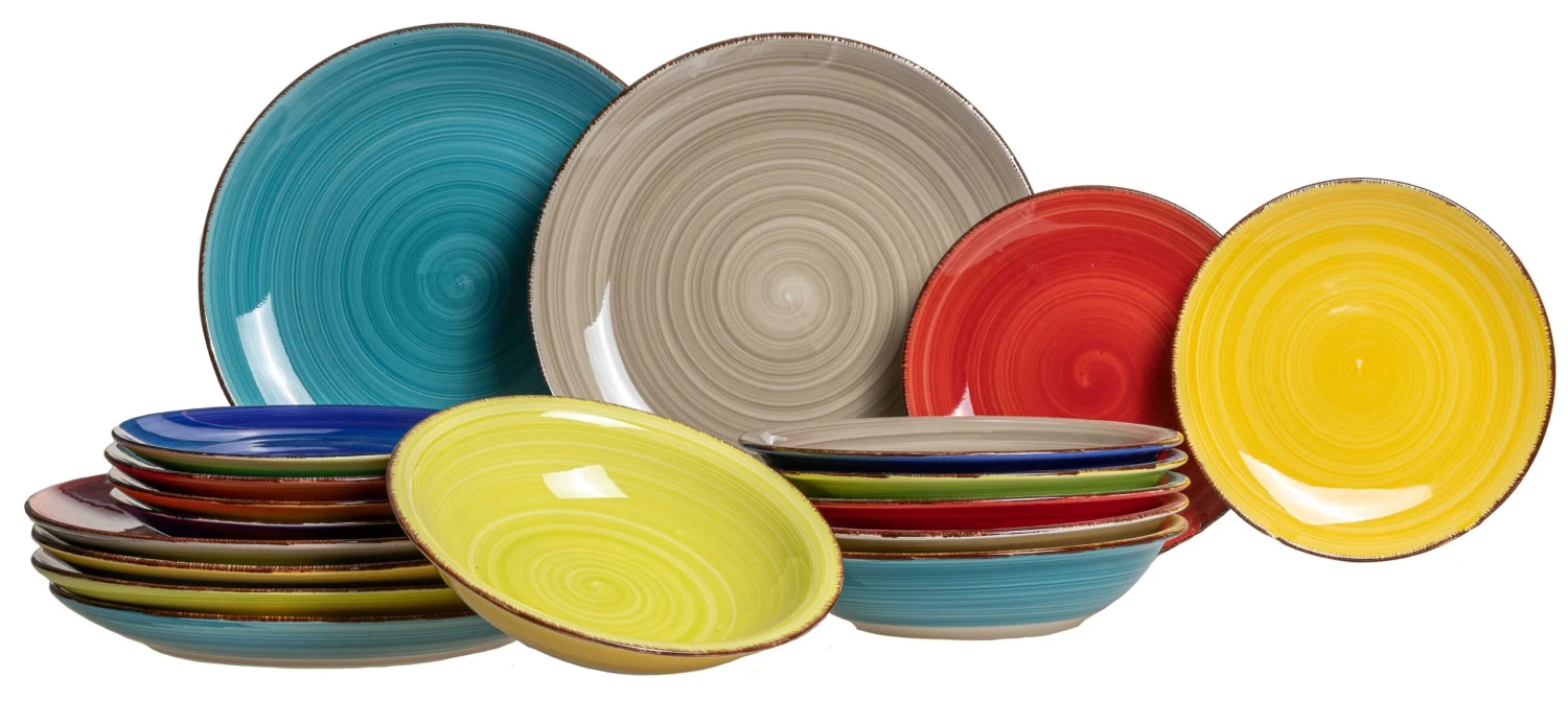 Elk dinerbord, diepe bord en ontbijtbord bestaan uit de volgende kleuren zoals u op de foto ziet: geel, donkerblauw, grijs, rood, lichtblauw en groen.